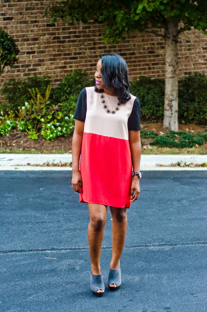 I decided to get dressed up and pulled out this number I bought from a friend who sells vintage clothes and accessories. It’s a chic shift dress which will look great on most bodies. Check her instagram page here. She carries a great deal of beautiful pieces, at awesome prices. I fell in love with this color block dress and it is so appropriate for fall. I paired it with one of my favorite slingback sandals and minimal accessories. I am loving the weather here is Atlanta and I can’t wait for the holidays, thanksgiving, Christmas and oh! my birthday the day after Christmas! I don’t dress up for Halloween but I can’t wait to dress my little ones and take them trick or treating for the first time:)