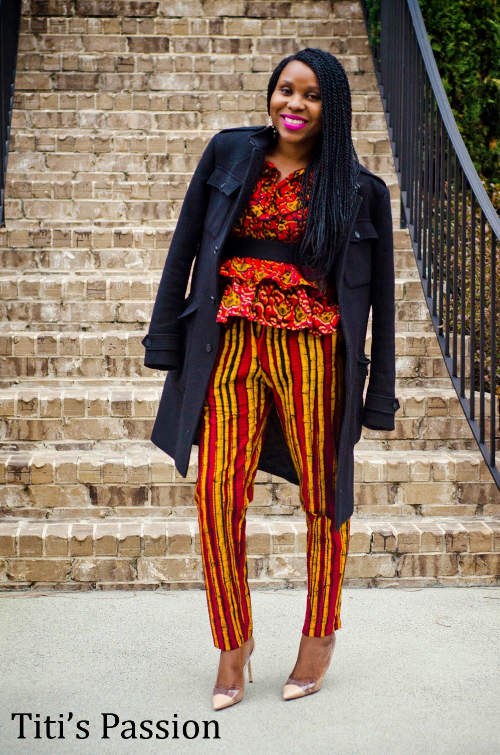 I decided to take pictures with both my black and nude pumps because I loved both looks 🙂 I borrowed my hubby’s coat, which just paired perfectly with the outfit. (Yes I dig through his stuff once in a while, lol) What do you think of the look? Which shoes would you have paired the outfit with? Do you ever wear ankara in the winter?