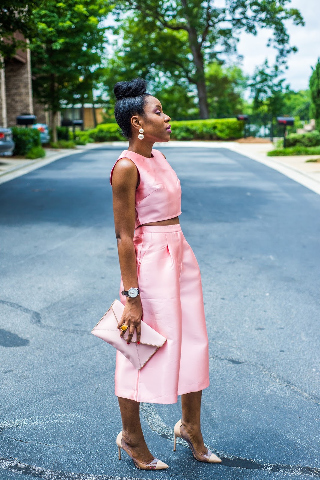 I have been on the fence about trying the Culottes trend which has been around for a while now. That is until I saw this tailored matching set that changed my mind :-). A feeling I am sure some of you (ladies, anyone??) can relate to at some point or another. This silk number is nothing short of fabulous. The best thing about the outfit is that I can wear it also as separates. I decided to pair the set with my favorite nude heels and pink clutch and kept my accessories at a minimum. What do you think? Have you tried this fashion trend?