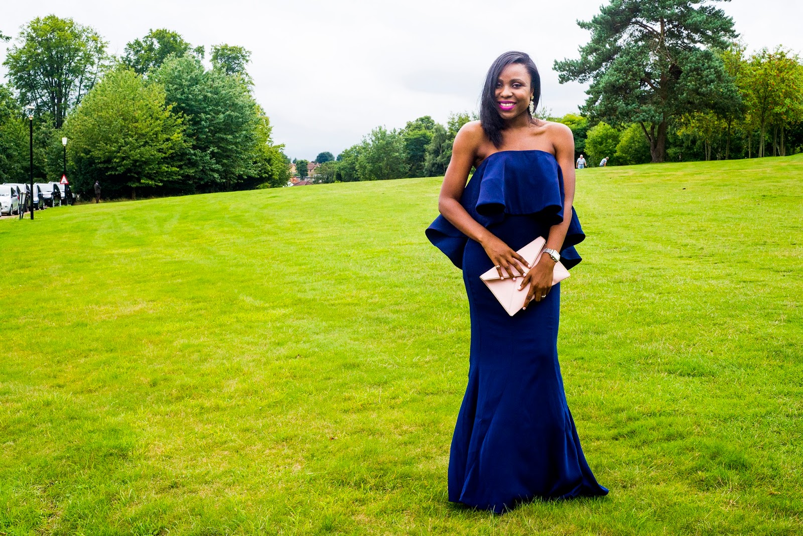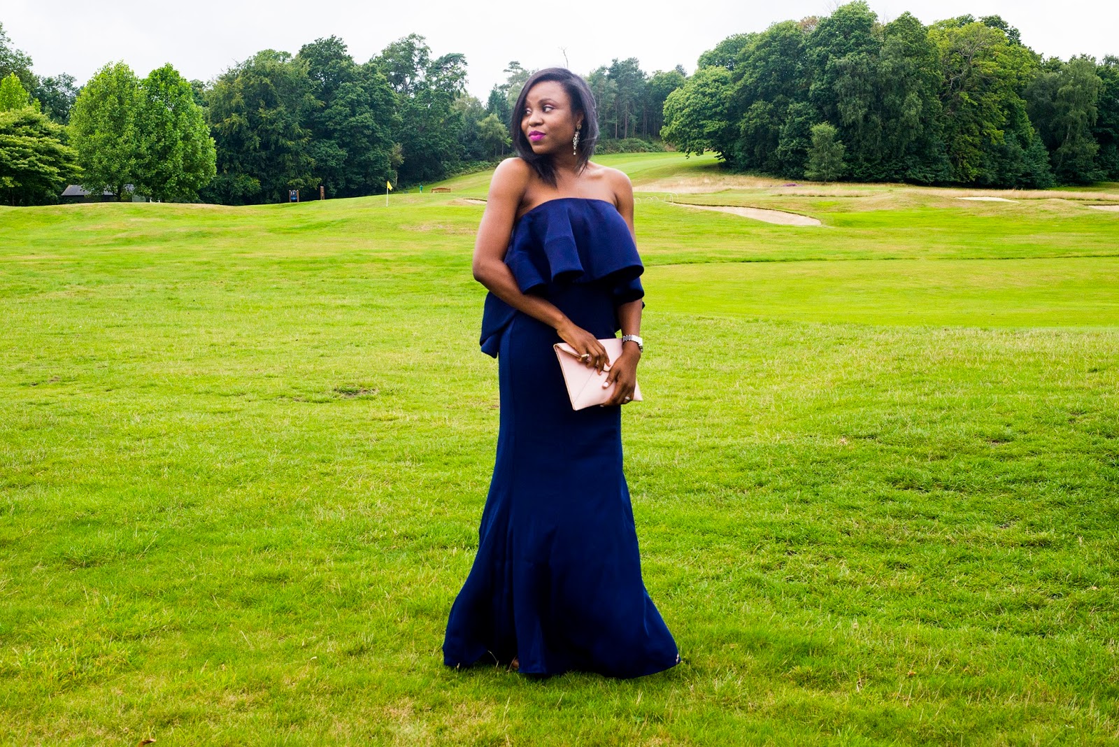 I was traveling to London for a friend’s wedding, so I decided to switch things up and try something different. (Besides we all know how unpredictable the British weather is, lol) so I came prepared. I love the exaggerated frill, it takes it from a simple navy dress to a head turner:) I kept the rest of my look at a minimal and chose lighter colors to compliment my navy blue dress. What do you think of the look and do you wear long dresses for any occasions?