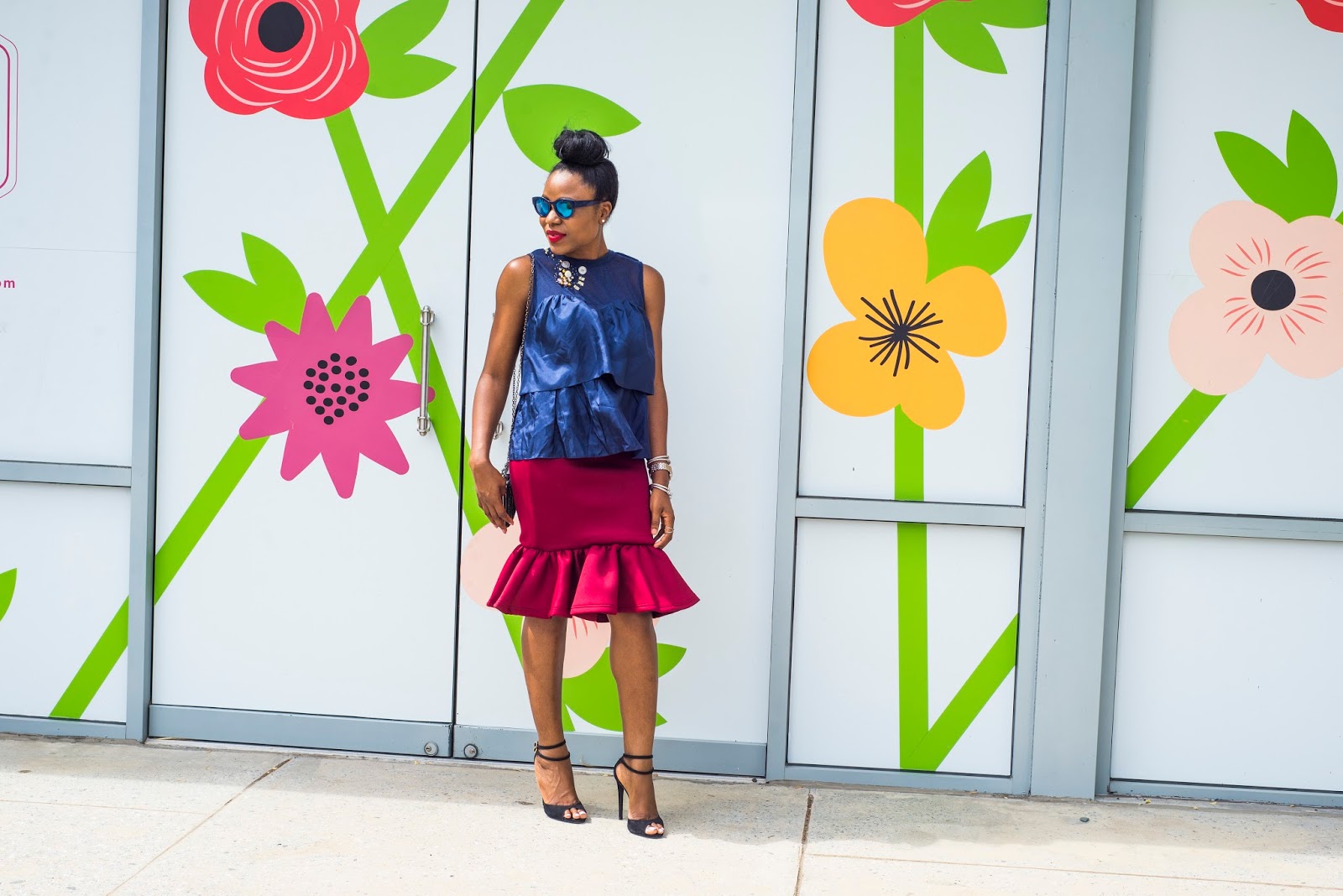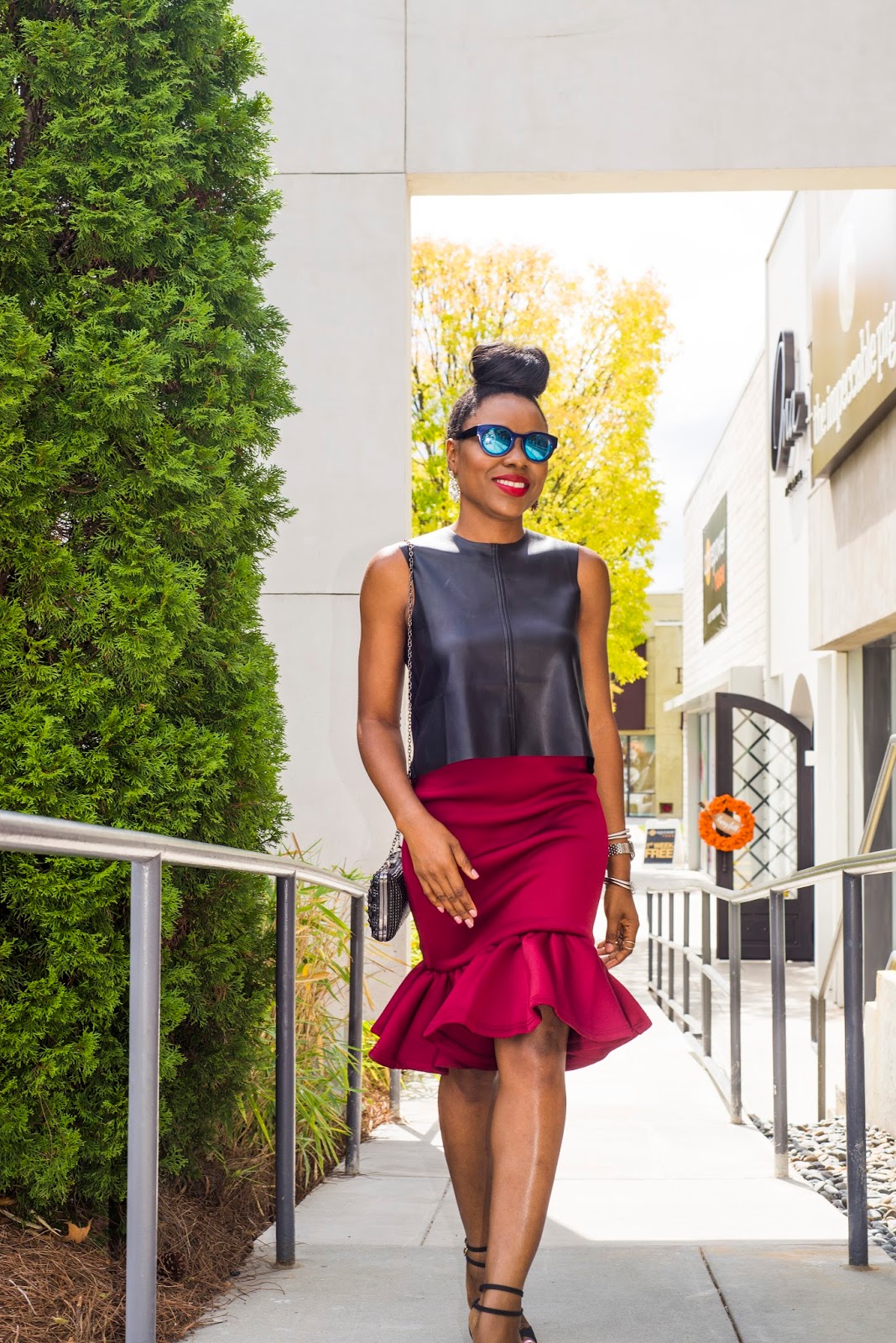 Hi and thanks for stopping by my blog! I am starting off the new week in a crop and flutter hem skirt. I am a big fan of flutter hem skirts (seen on my recent post here) and I am still wearing it this fall in burgundy! This look will be perfect for a night out or even a day look.