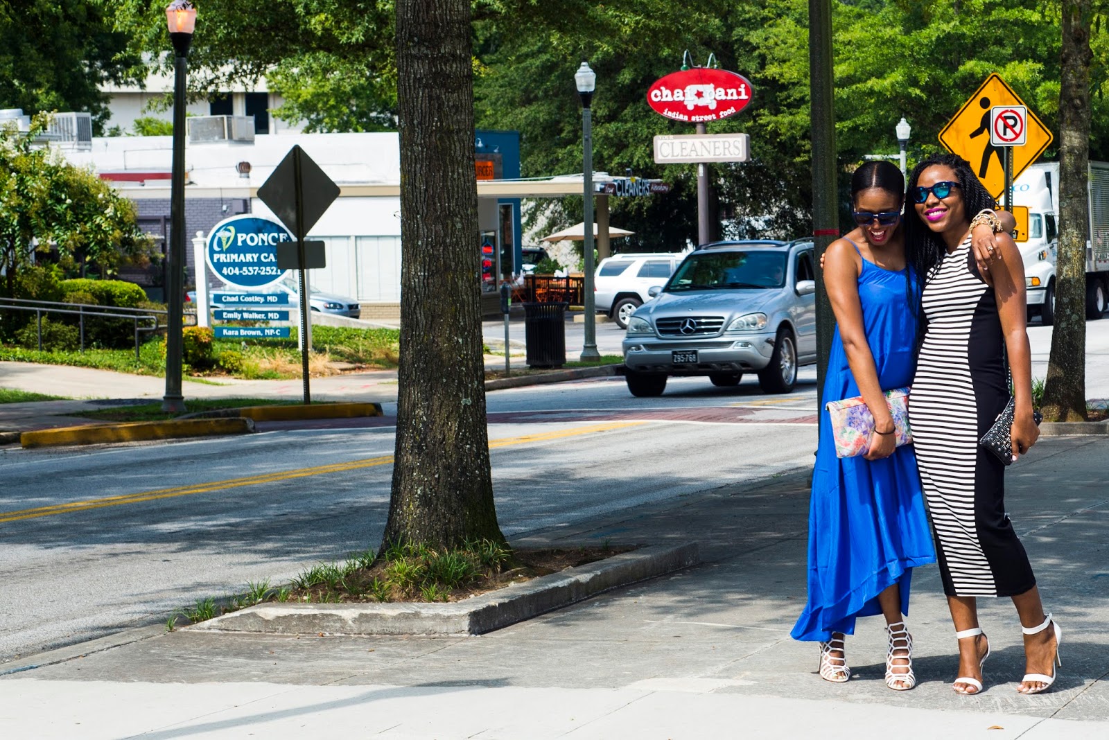 We had a great time during the shoot, as you can tell from the pictures, which took place in downtown Decatur, Georgia. I love the stripped figure hugging outfit I wore, it will be perfect for a date night, party or even a birthday celebration. My favorite part about the dress is that it enhances my shape perfectly (no spanx needed, lol). Monica’s chic maxi in a perfect blue hue, is very versatile. I love the easy style and how it will look amazing on different body types. Have fun with both looks or which ever speaks to you. Check back next week for my personal photos from the shoot, they are as amazing as these:-) Thanks for reading and enjoy the rest of your weekend!