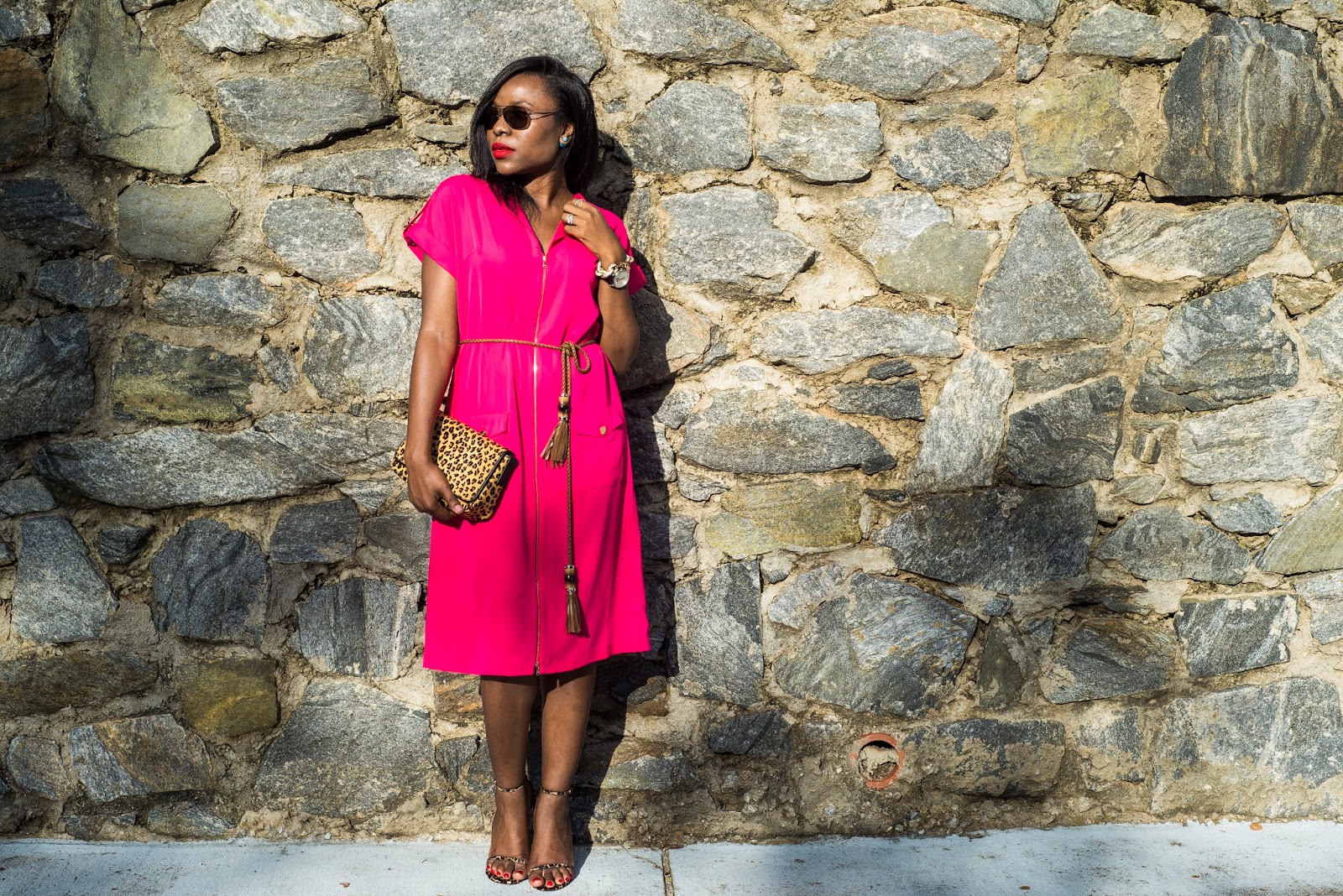 Trench Wrap Dress: Ladyee Boutique | Shoes: Stuart Weitzman Nudistsong or here similar here| Clutch: F&W Style similar here| Sunglasses: Ray Ban Aviators similar here| Earrings: Kenneth Jay Lane similar here| Bracelet: J Crew similar here| Watch: Baumier & Mercier similar here| Lipstick: MAC Ruby Woo