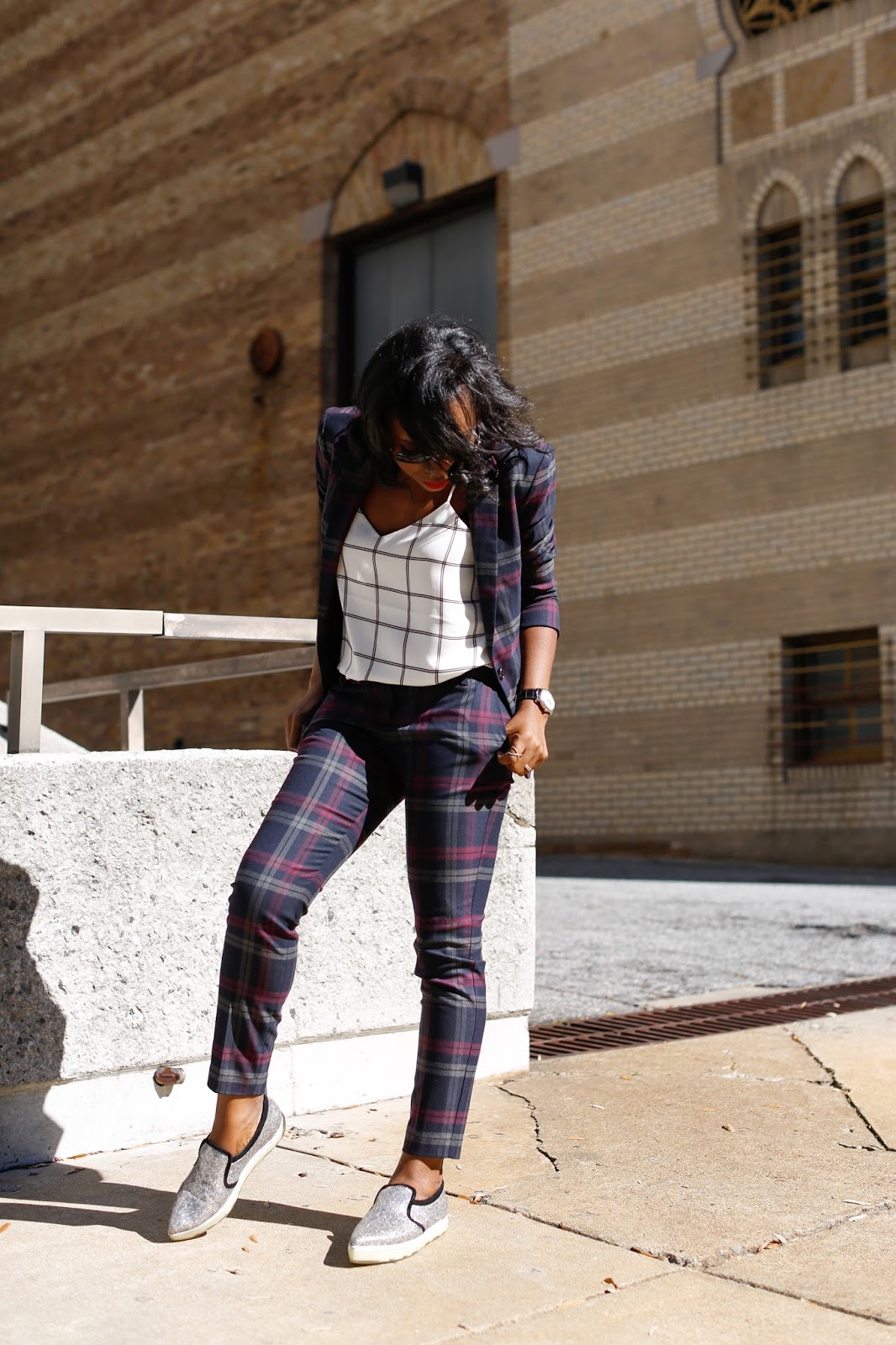 I definitely gravitate toward pieces that can trasition to night looks. Plaid is in, so this jacket and cropped pant set by Express is perfect for fall. I see suits as investment pieces, this set will definitely stand the test of time. They really had me at cropped pants 🙂 I love the fit, the pant sits right on your natural waist, so heavy lunches will be no problem in this suit LOL.