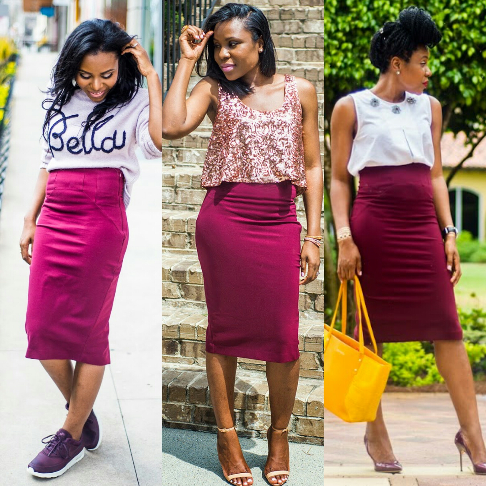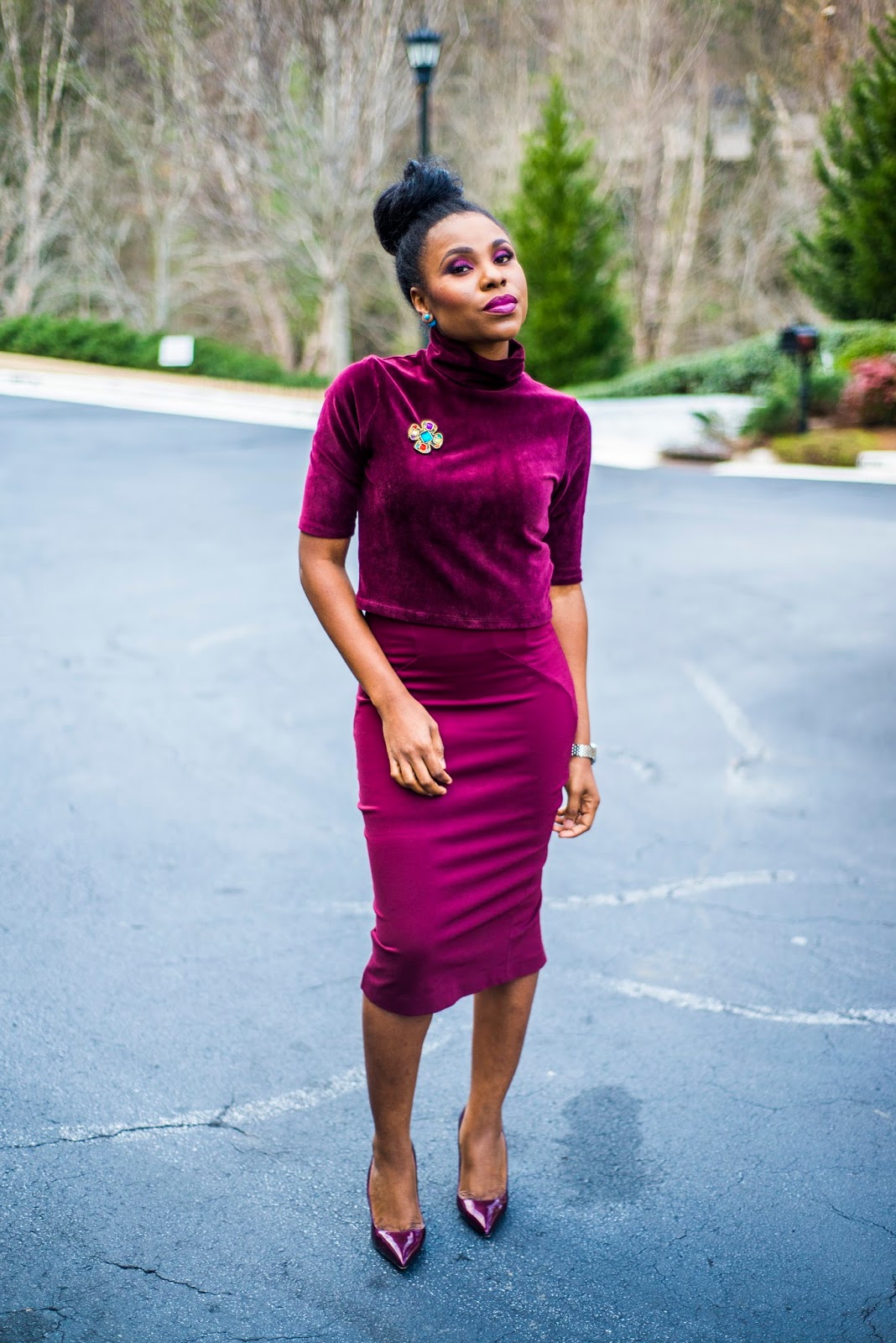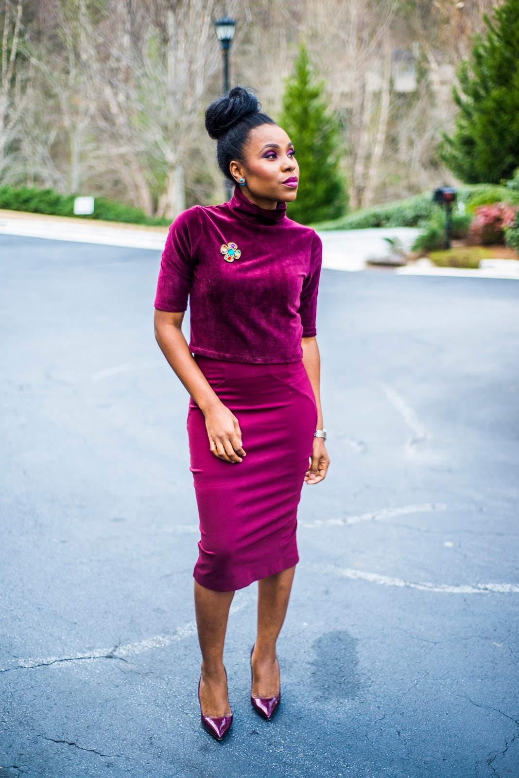 Thanks for stopping by my blog. I am ending the week in this monochromatic work or play inspired look. The monochrome trend is a classic look that has always been around. I am a firm believer in finding new ways to wear the same outfit so today, I am wearing a skirt that I have worn previously, here and here and here. A well fitted pencil skirt should be a staple in every woman’s closet. While black is fantastic, varying to other colors such as wine is a great idea.