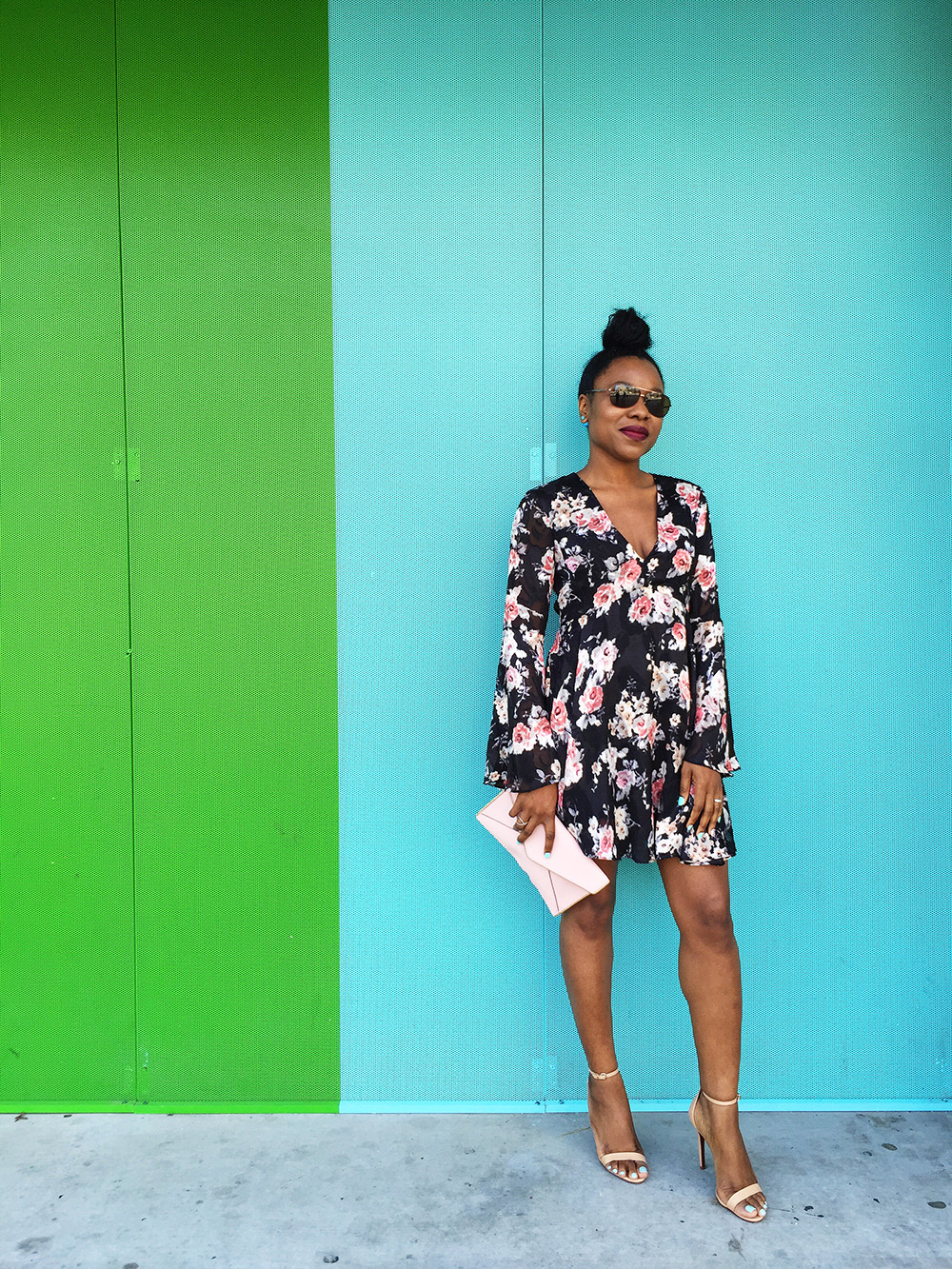 I wanted to wear something that described my style for the shoot. I love floral prints, and mini dresses so this floral flare dress by Lucy Paris was perfect. I literally walked into my local Bloomingdale’s (now sold out) looking for something trendy but affordable when this outfit caught my eye. I love the sleeves and its a perfect example of the exaggerated sleeve and floral trend. The best part was the price point, on sale for $15!