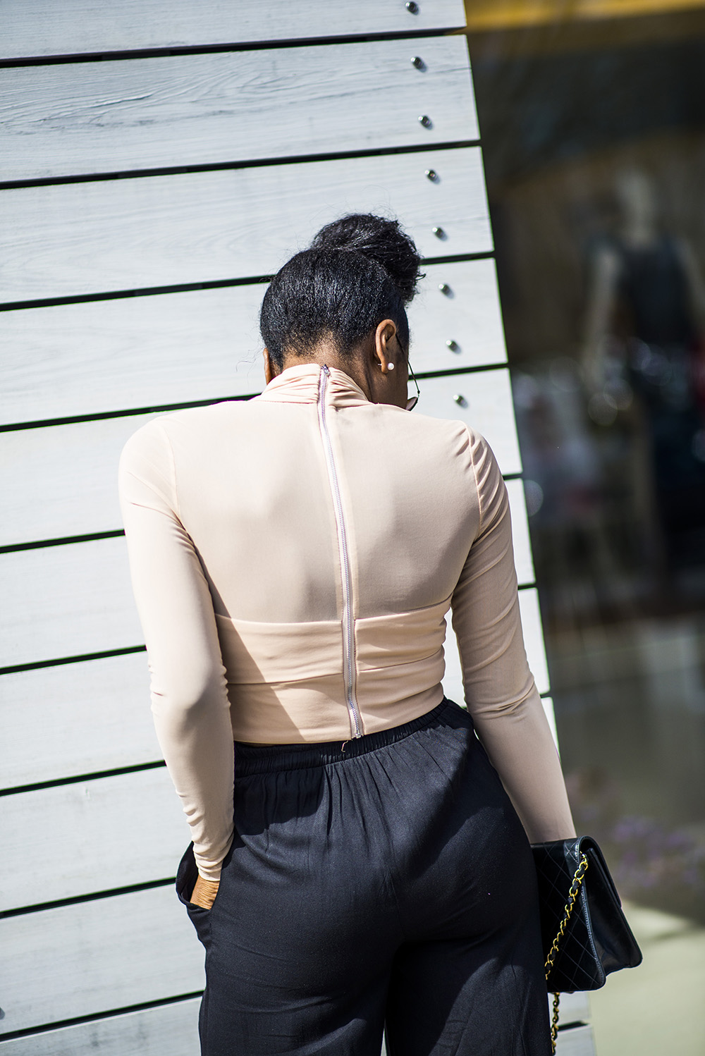 I am wearing nude sandals and chose these shoes to match my nude blouse.I wanted to stick with blacks and nudes, so I grabbed my vintage Chanel purse.