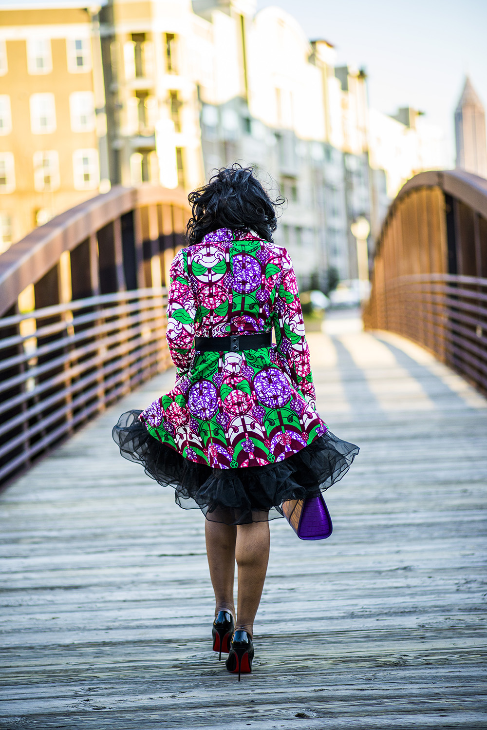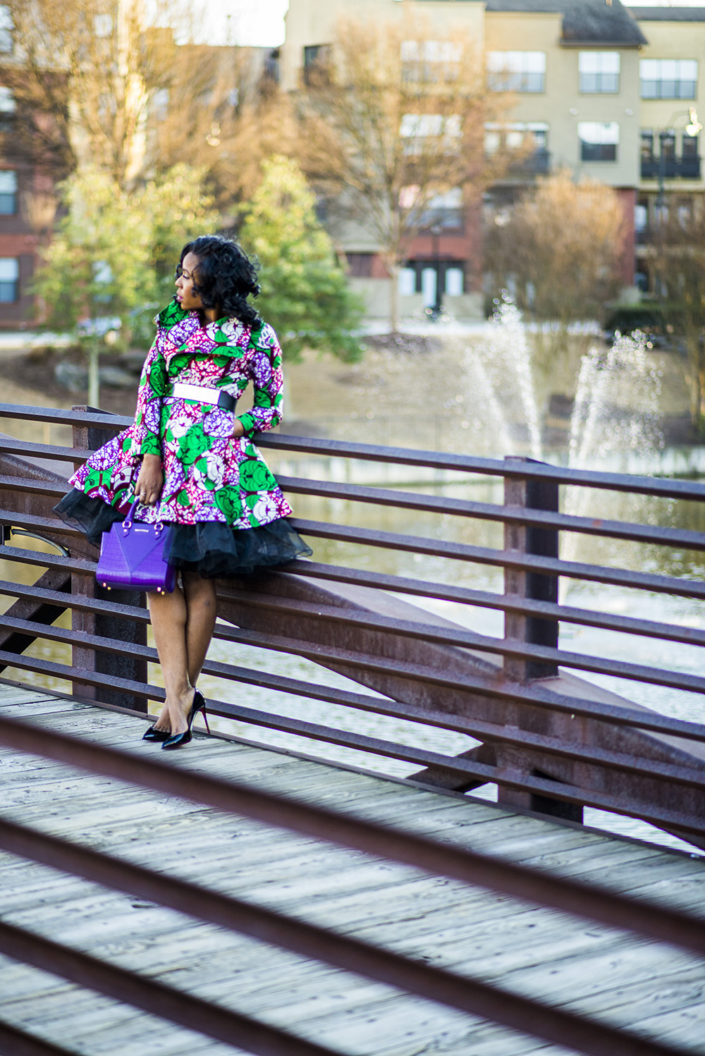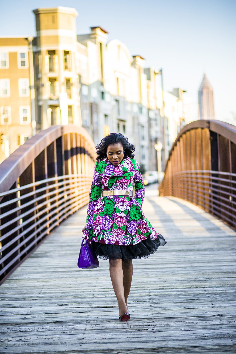 My croc embossed purple Bella Bag is by luxury leather handbag brand F & W Style. Check them out for amazing leather accessories. My shoes are the classic Pigalle Christian Louboutin pumps in black. My gold and black stretch belt which I wore for waist definition, is by Bebe.