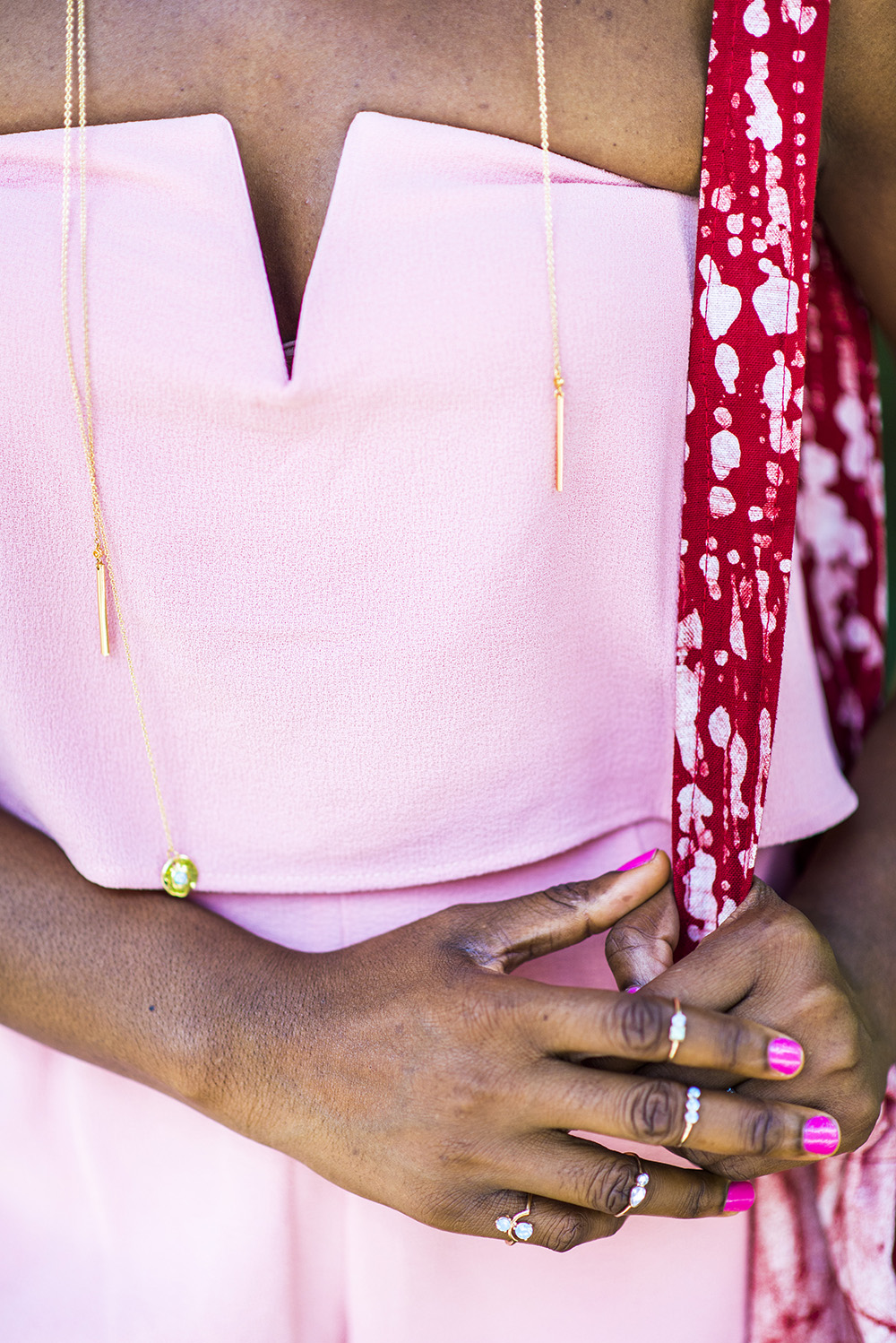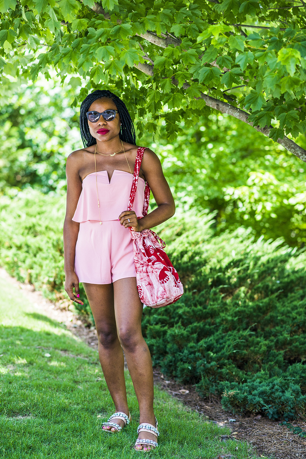 Rompers are one of my favorite go to fashion items because they require no fuss. I love this strapless number by Mystic a brand available at Bloomingdales. It is available in white and black too. I am wearing a small, my regular size. My handbag is by an African brand called Koele. They make bags and other leather goods using leather and African prints Ankara and Batik. I am carrying their reversible batik bag which is perfect for summer and available in other gorgeous colors. Check them out for stylish pieces.
