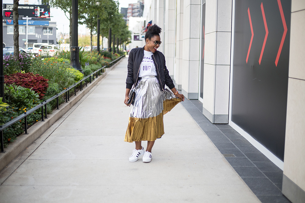 Thank you for stopping by the blog today, TGIF! I am ending the week with another look featuring a pleated skirt. Unlike the Maxi skirt from Tuesday’s post, today is centered on how I style a graphic t-shirt. Honest moment, you won’t find me in most of the outfits I feature on my blog on a good day while I am running around town. My go to outfits for my busy life is typically denim or leggings, a t-shirt and a pair of sneakers. It’s more practical for my lifestyle and I am sure some of you can relate to that statement. I am sharing how I put my spin on making basic t-shirts stylish and wearable outside the house.