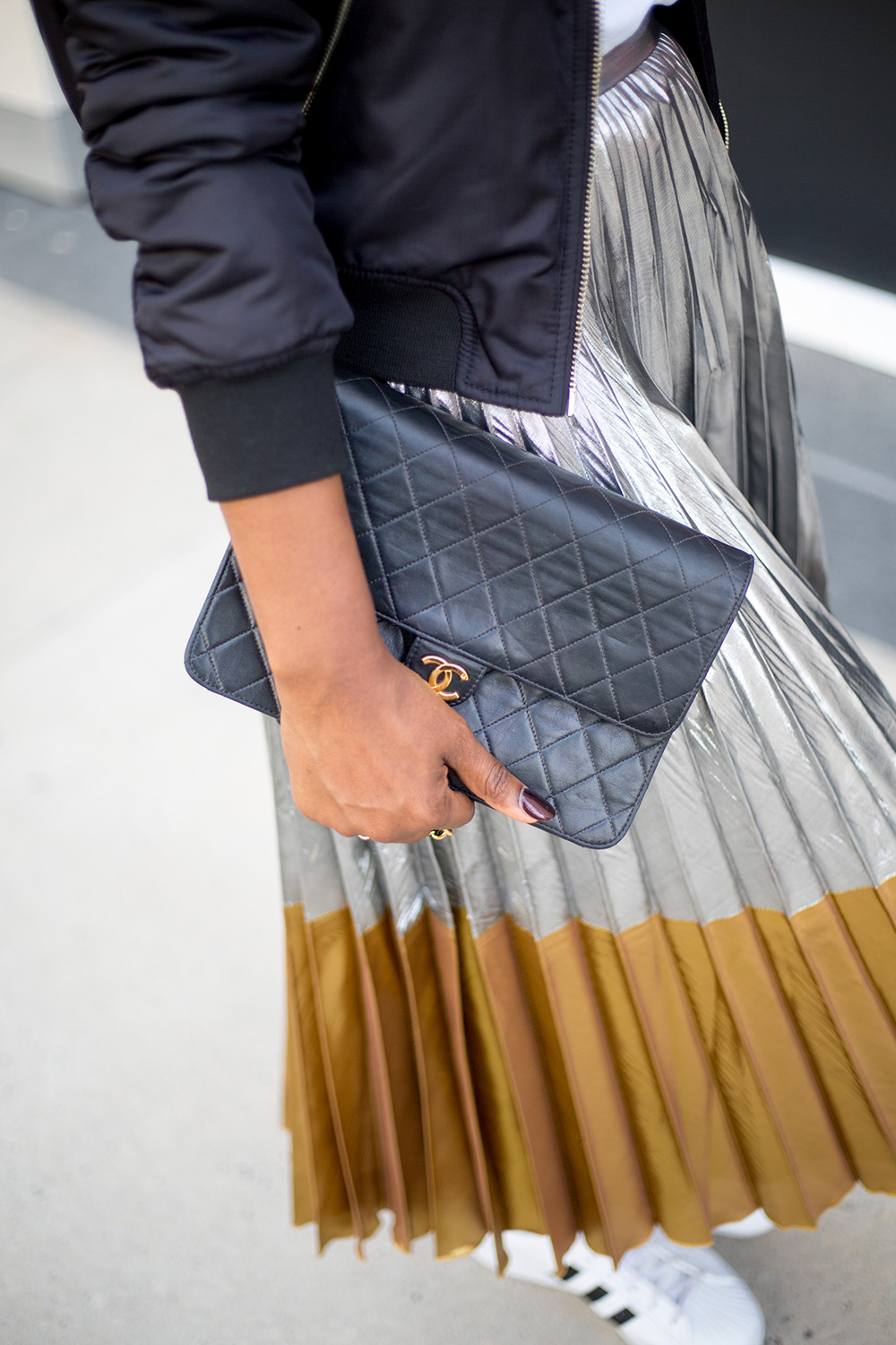 Shirt: Asos(sold out) similar here| Skirt:Asos similar here| Jacket: Topshop similar here|Sneakers: Adidas similar here| Watch: Daniel Wellington| Sunglasses: Ditto| Purse: Vintage Chanel|Lipstick:ColourPop|