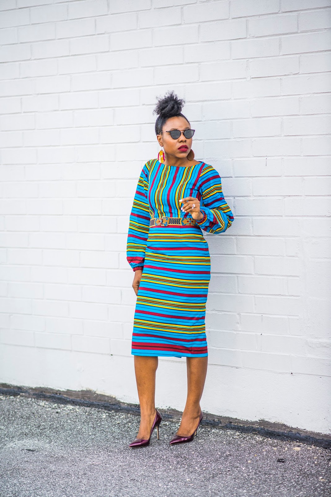 I love the striped bold multicolored print of the Jasmine Ankara dress and its’ bishop sleeve. It is all about the sleeves right now in fashion, so this dress is right on-trend. It has an optional belt a great addition for a more defined waist line. I love that it is a separate piece which gives you the option to style it with different types of belt to switch the look. I am wearing a size small my true size. Order yours via their website.