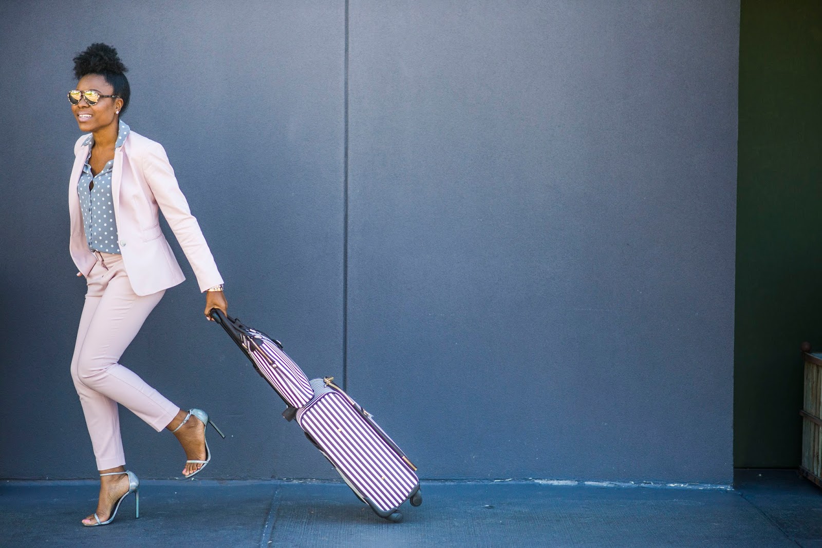 Today’s look is inspired by the working woman who wants to put her best face forward at work whether she runs her business or simply is a corporate gal. I chose a light pink suit because it is a color some shy away from because it might seem a bit playful. When paired correctly like I did with my grey polka dot blouse, it gives it a sophisticated edge plus you look stylish. It is also a perfect shade for Spring and Summer. It is time to store the black and blue suits and opt for lighter colors. My suit comes in other gorgeous colors too and in tall.