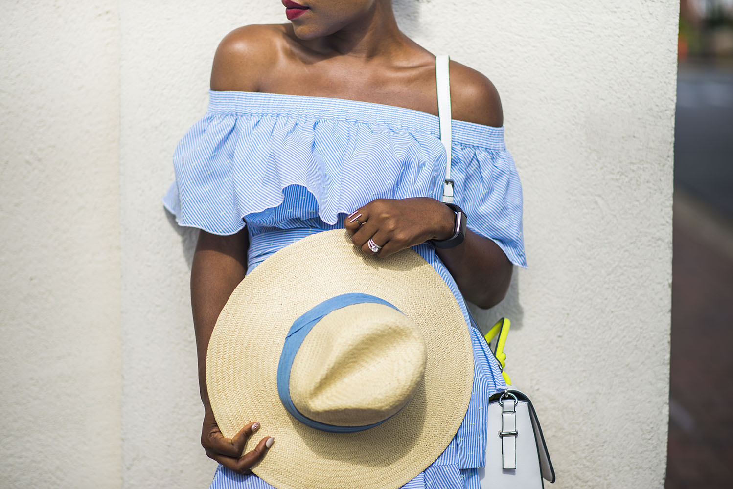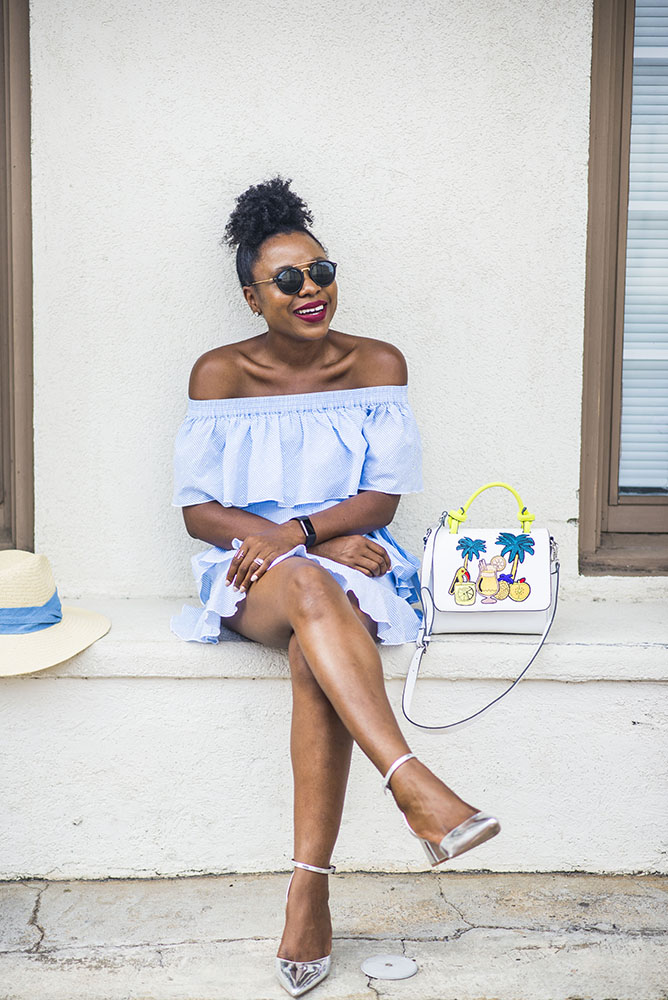 I decided to style this ruffle stripe dress with my go-to pointed heels shoes by Asos. I love how they compliment this outfit for a dressy day time look. Another option is to pair them with slides which are perfect during vacation. While a straw bag is a good travel hangbag, my embroidered Zara bag works too and it’s $49.90.
