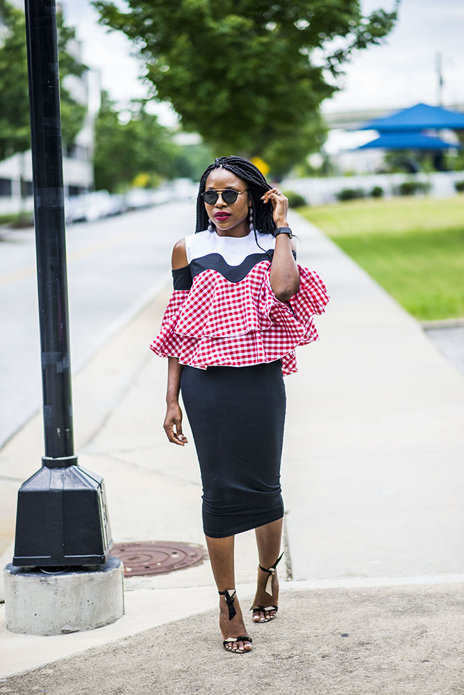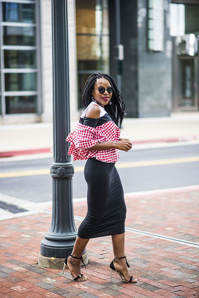 I hope you had a great week? I am ending the week in gingham. It has been a huge trend for a while now and finding unique items can be sometimes tasking. This open shoulder tiered top is a unique gingham top and the best part is that it is only $24. You can style it multiple way, with a high waist midi skirt like I did or with a pair of jeans.