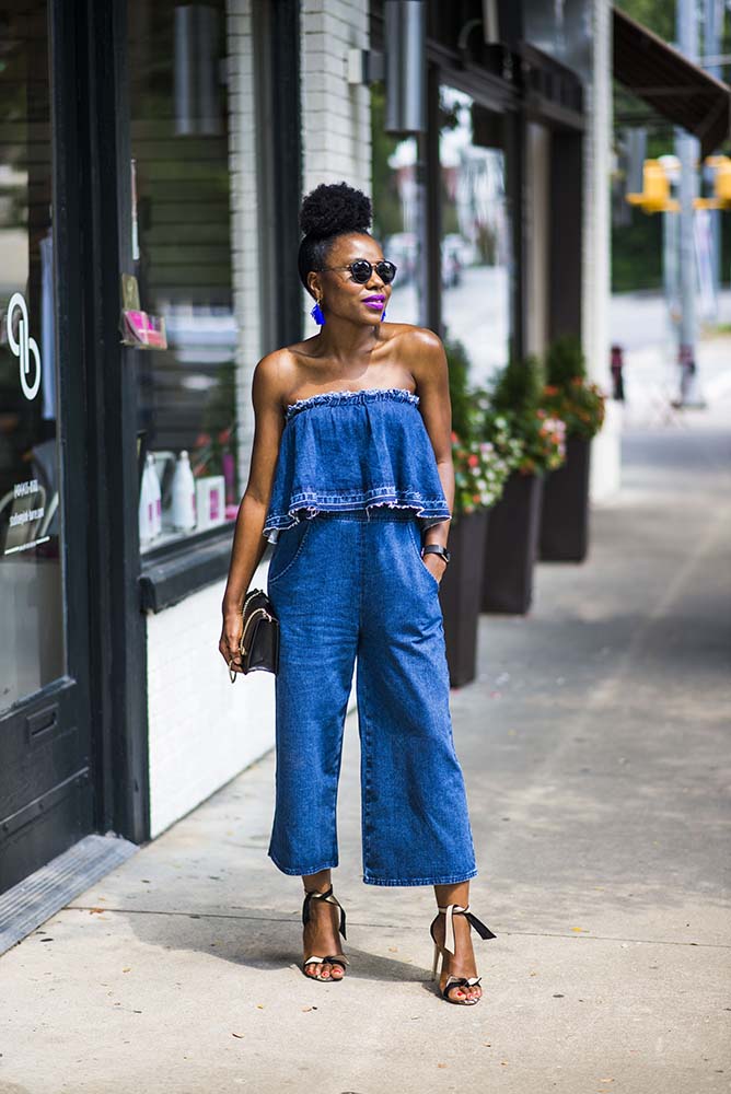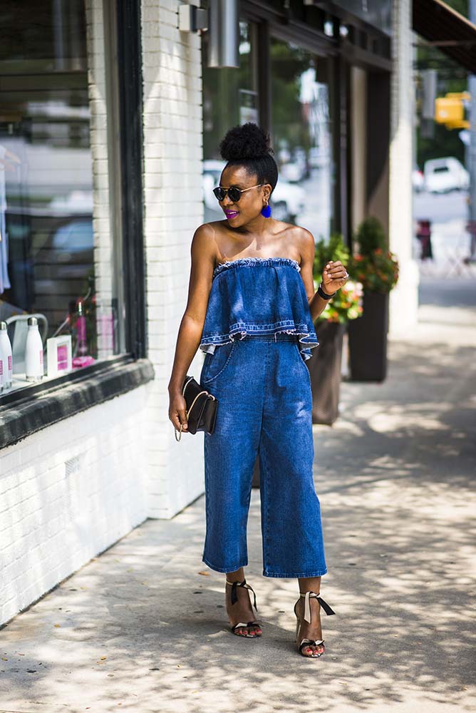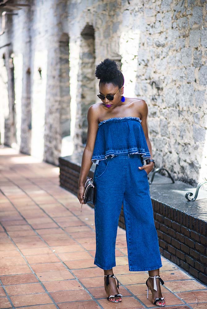 How are you doing? Fashion Tuesdays are back so is my fro. My crochet braids lasted well, it grew my hair and was the easiest protective style I have ever worn. Give it a try if you are on the fence. Today I am sharing this denim jumpsuit by J.O.A with you. I have a thing for jumpsuit bathroom issues aside, this strapless denim is so chic and comfortable.