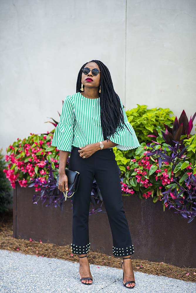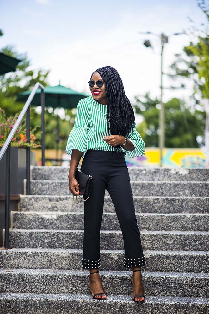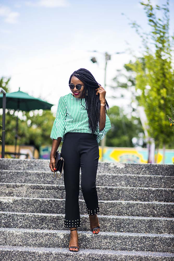 I hope you have had a great week? I am ending the week in pearls. Pearls/ pearl embellishments have been a big trend this Summer. This dress I wore a few months ago is a classic example and let’s not forget a Summer favorite, this pearl sandals. My striped top and pants are both by Zara, my favorite high street fashion store.