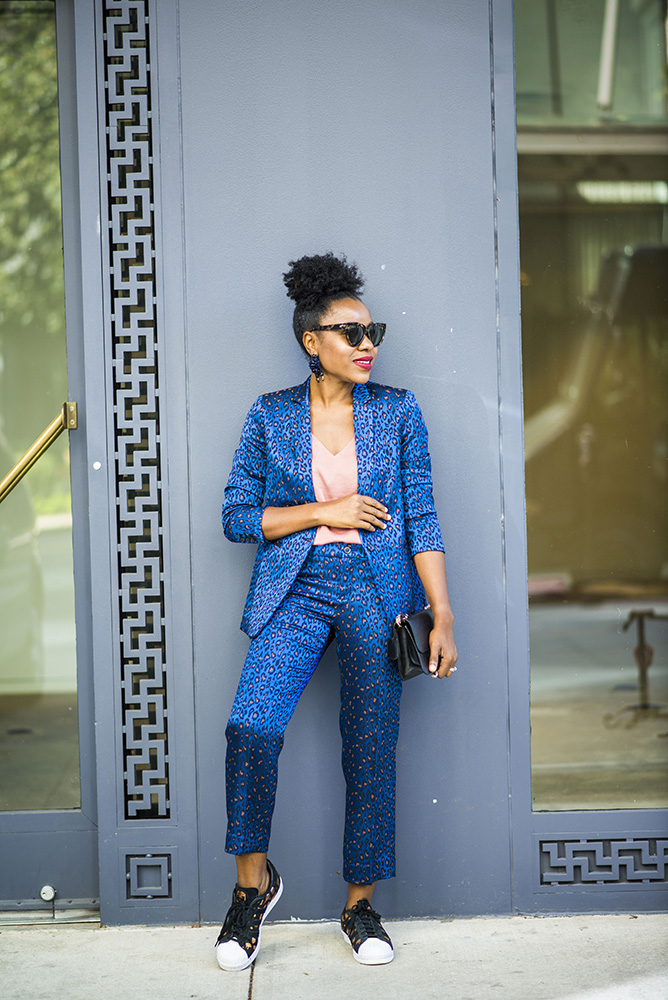 Save 40% off my leopard print blazer and pants. You can buy my blazer for $106 with code BRFAMILY. It is available in petite and tall sizes too. I decided to style this look with my Adidas sneakers(mine are sold out) to show you how it works without heels.